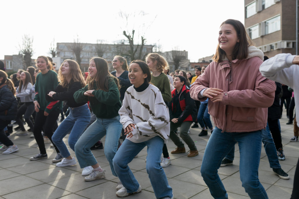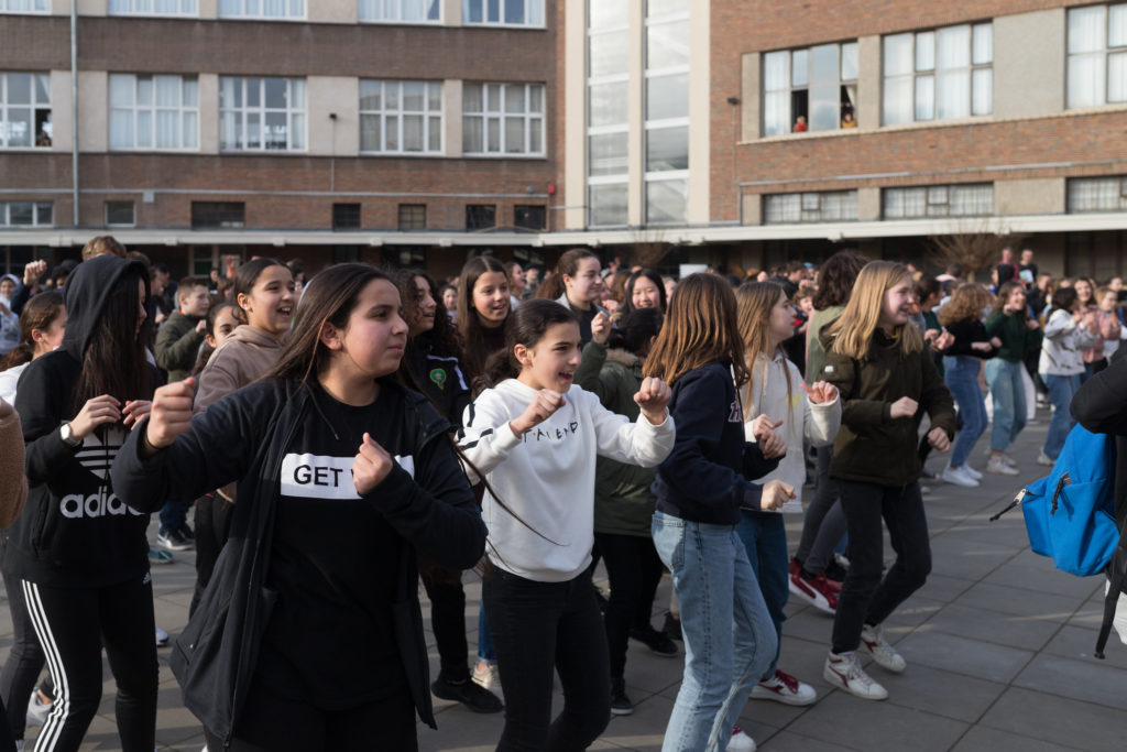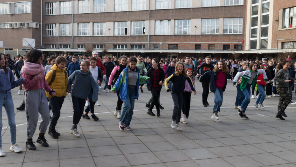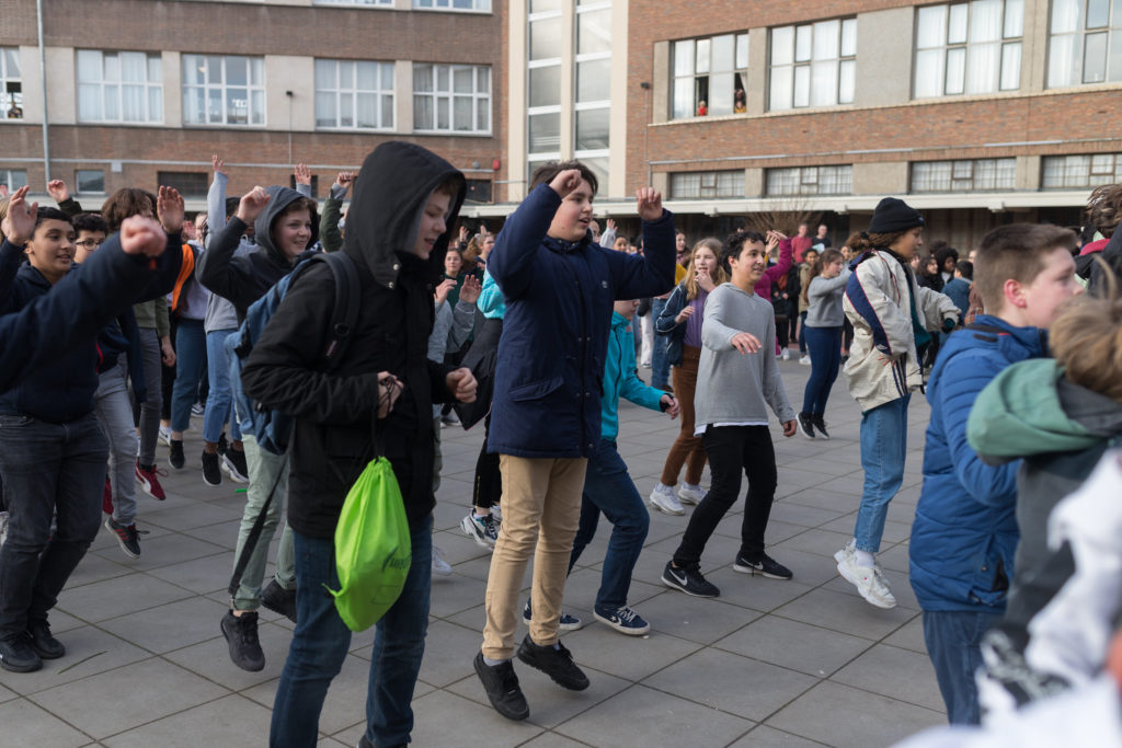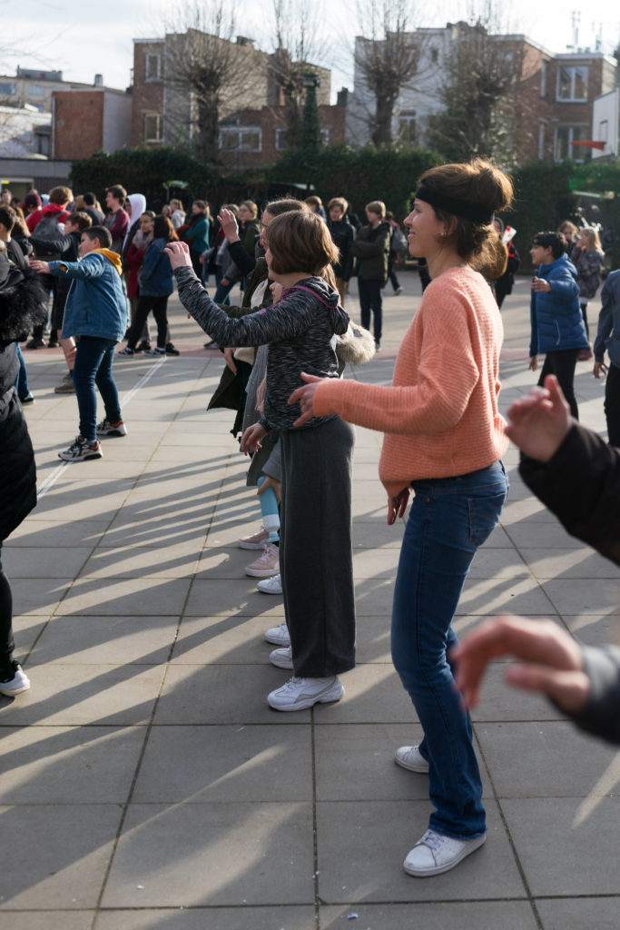Wie erbij was en er naar stond te kijken, kon alleen maar blij en vrolijk worden met zo’n Valentijnsgeschenk. Heerlijk hoe er zoiets onverwachts op school kon gebeuren met deze keer eens de eerstejaars die in het middelpunt van de speelplaats stonden. Ze zijn behoorlijk ‘musclés’, onze eerstejaars.