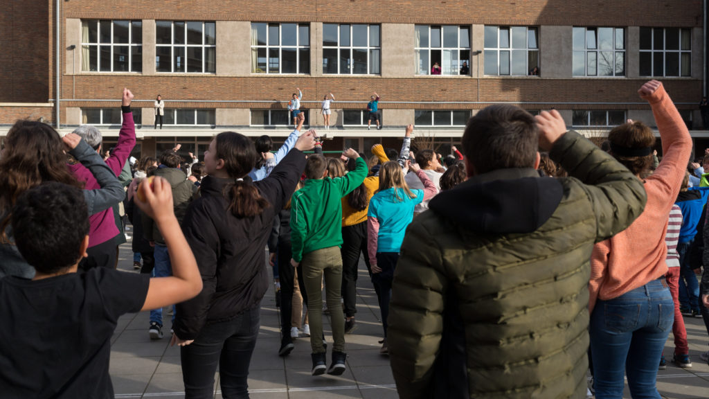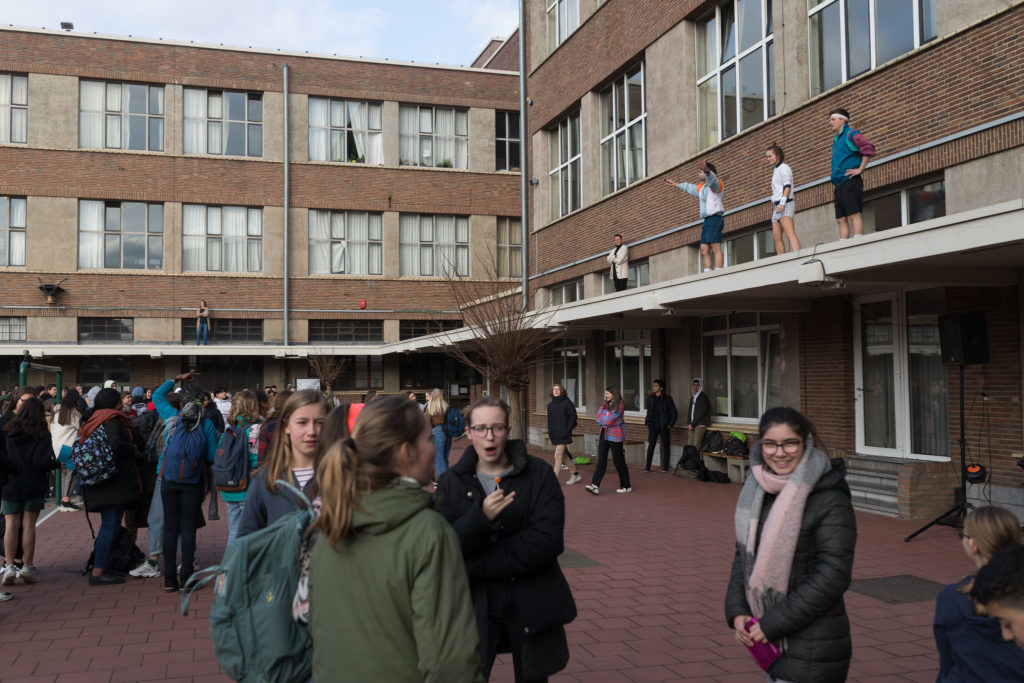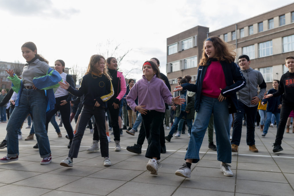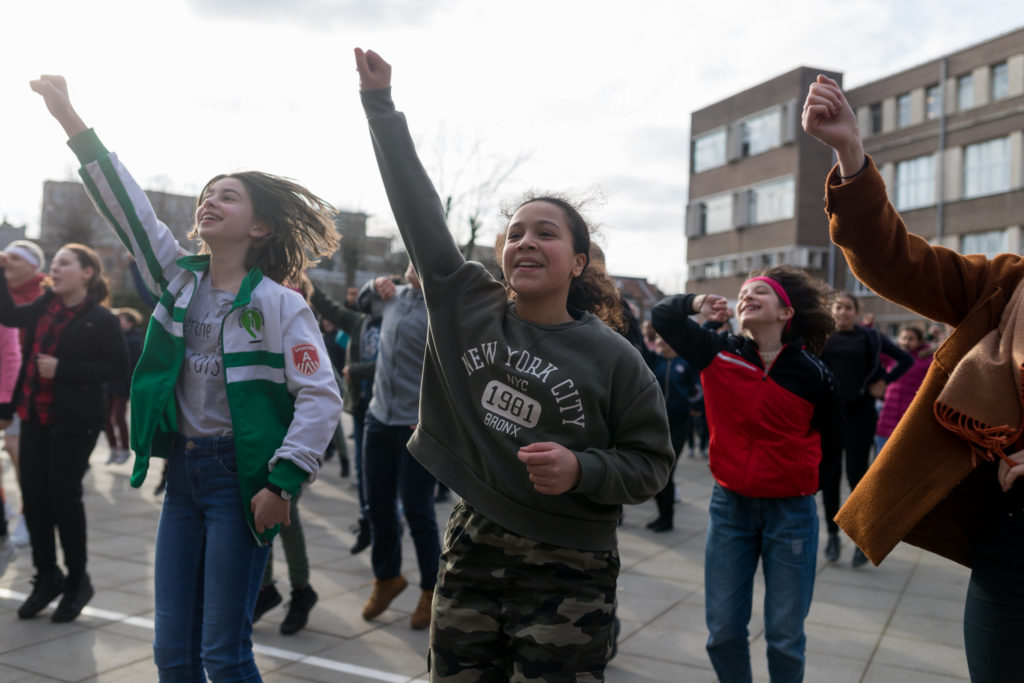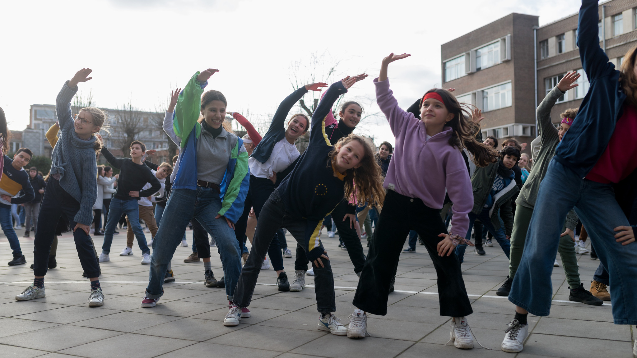Wie erbij was en er naar stond te kijken, kon alleen maar blij en vrolijk worden met zo’n Valentijnsgeschenk. Heerlijk hoe er zoiets onverwachts op school kon gebeuren met deze keer eens de eerstejaars die in het middelpunt van de speelplaats stonden. Ze zijn behoorlijk ‘musclés’, onze eerstejaars.