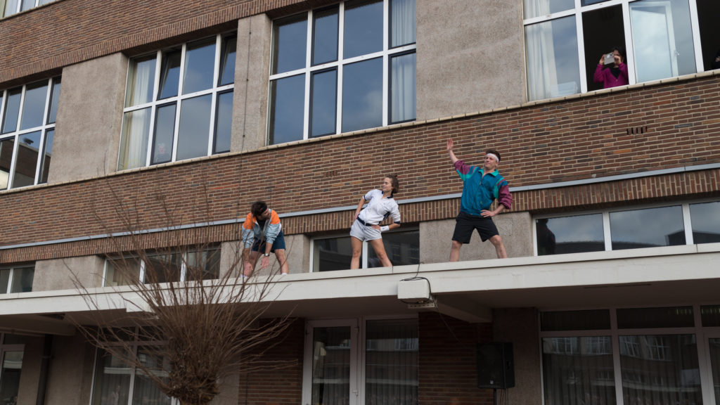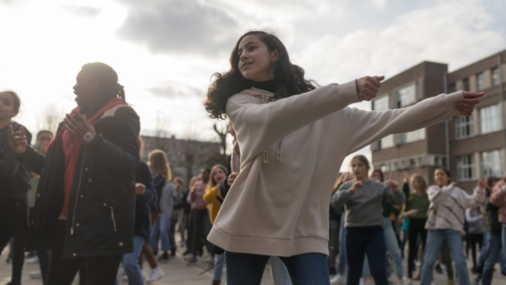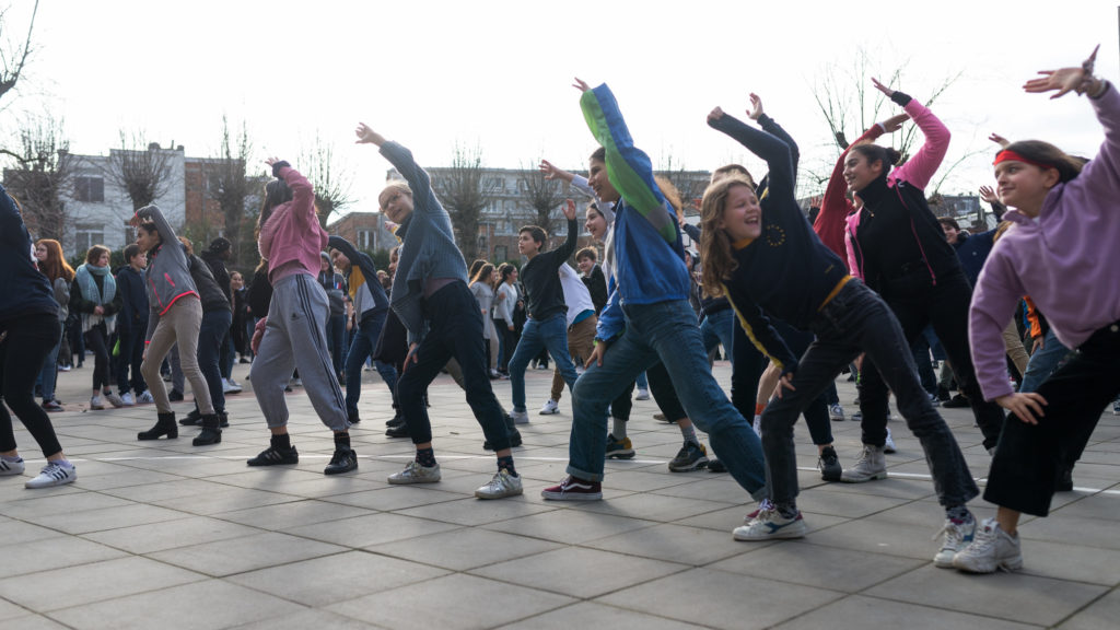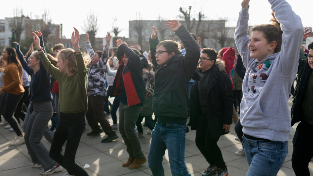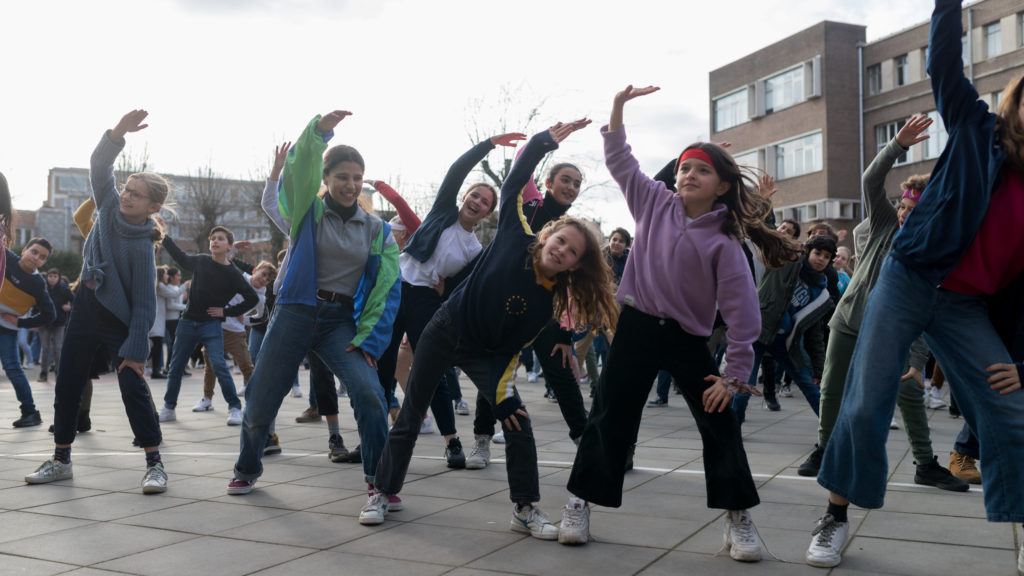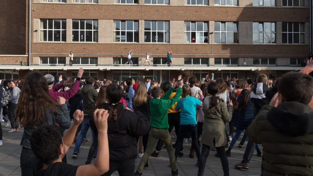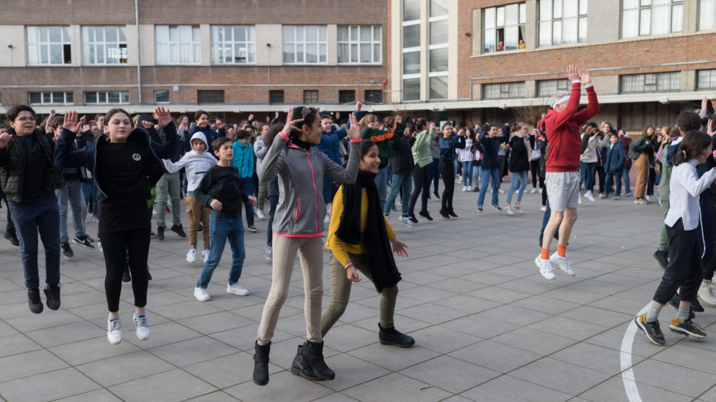 Drie even fel als ludiek geklede leerkrachten LO stretchen en warmen zich op. Het zijn, inderdaad toch goed gezien, dhr. Franck en Vernimmen die mevr. Brawers flankeren. Wat gefluit, muziek wordt luider en plots begint het midden van het voetbalveld te bewegen, alle eerstejaars naar links, bijtrekpasje naar rechts, …