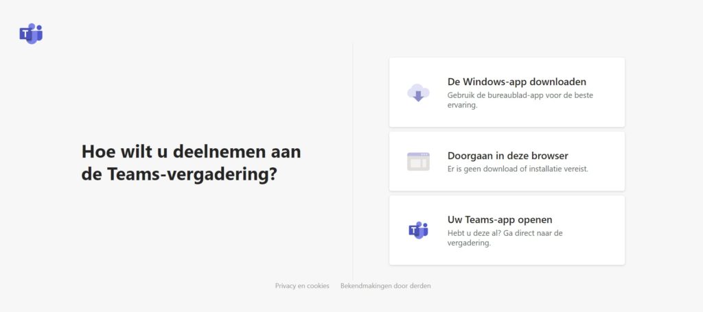 Voor het online gesprek heb je géén speciale programma’s op je computer nodig. Nadat je op één van de gesprekken hierboven geklikt hebt, kom je op een pagina die je vraagt of je het Teamsgesprek met een app wil opstarten of wil ‘doorgaan in de browser’. We kiezen voor deze tweede mogelijkheid zodat er niets geïnstalleerd hoeft te worden.