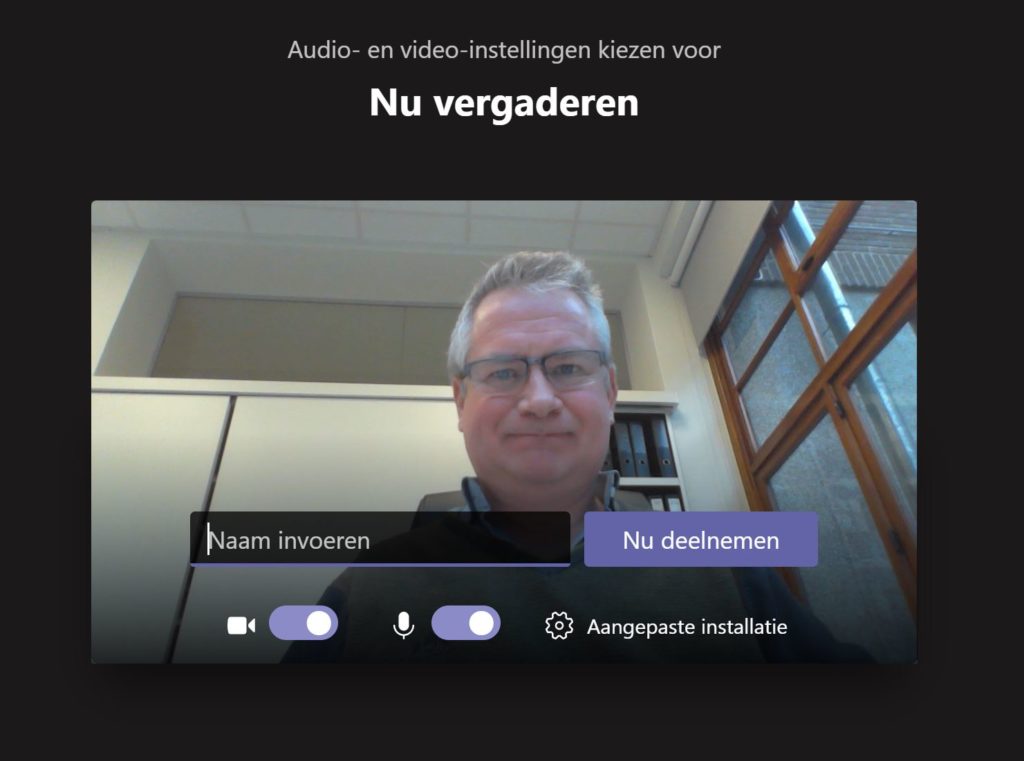 (2) Je hebt géén Office365 account. In het scherm waar je jezelf al in beeld ziet, moet je dan gewoon je naam invoeren vooraleer je op ‘nu deelnemen’ klikt en toegang krijgt tot de ‘vergadering’.
