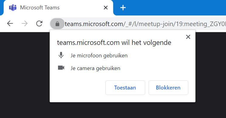 Het is mogelijk dat je eerst de toelating moet geven dat je camera en microfoon worden ingeschakeld. Daarvoor klik je op de knop ’toestaan’ in het dialoogvenster dat in je browser verschijnt: