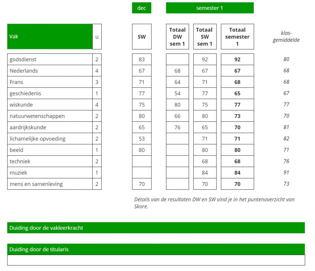Vakken die niet in het overzicht vermeld worden (bv. godsdienst, esthetica, lichamelijke opvoeding, …) maken geen onderscheid tussen DW en SW. Het semesterwerk telt daar mee voor 100% van de punten.