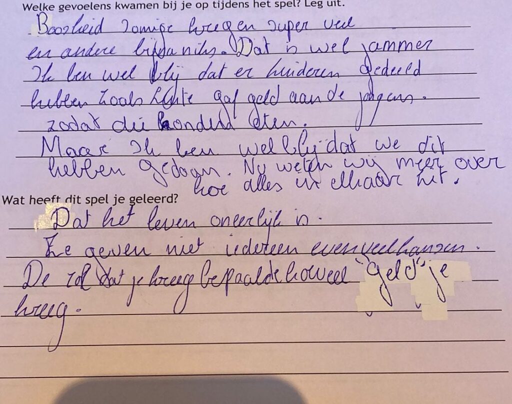 Uit de reflecties achteraf bleek hoe spannend, soms heftig maar uiteindelijk erg leerrijk het was om te voelen hoe oneerlijk het er soms in de wereld aan toegaat en te zien wat we daar (niet) aan kunnen doen. Gelukkig dat in onze kleine wereld van het eerste jaar alle etensresten gelijk werden verdeeld onder alle leerlingen.